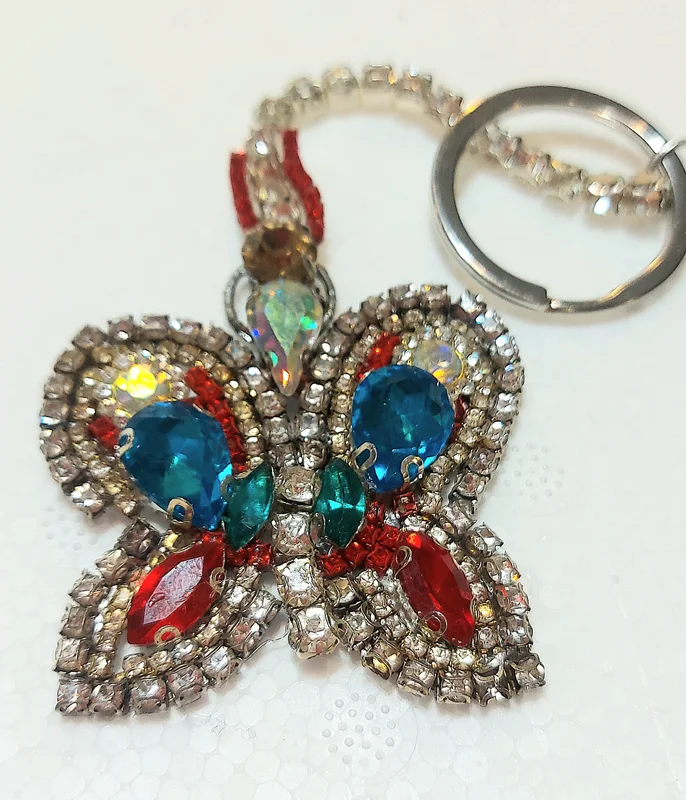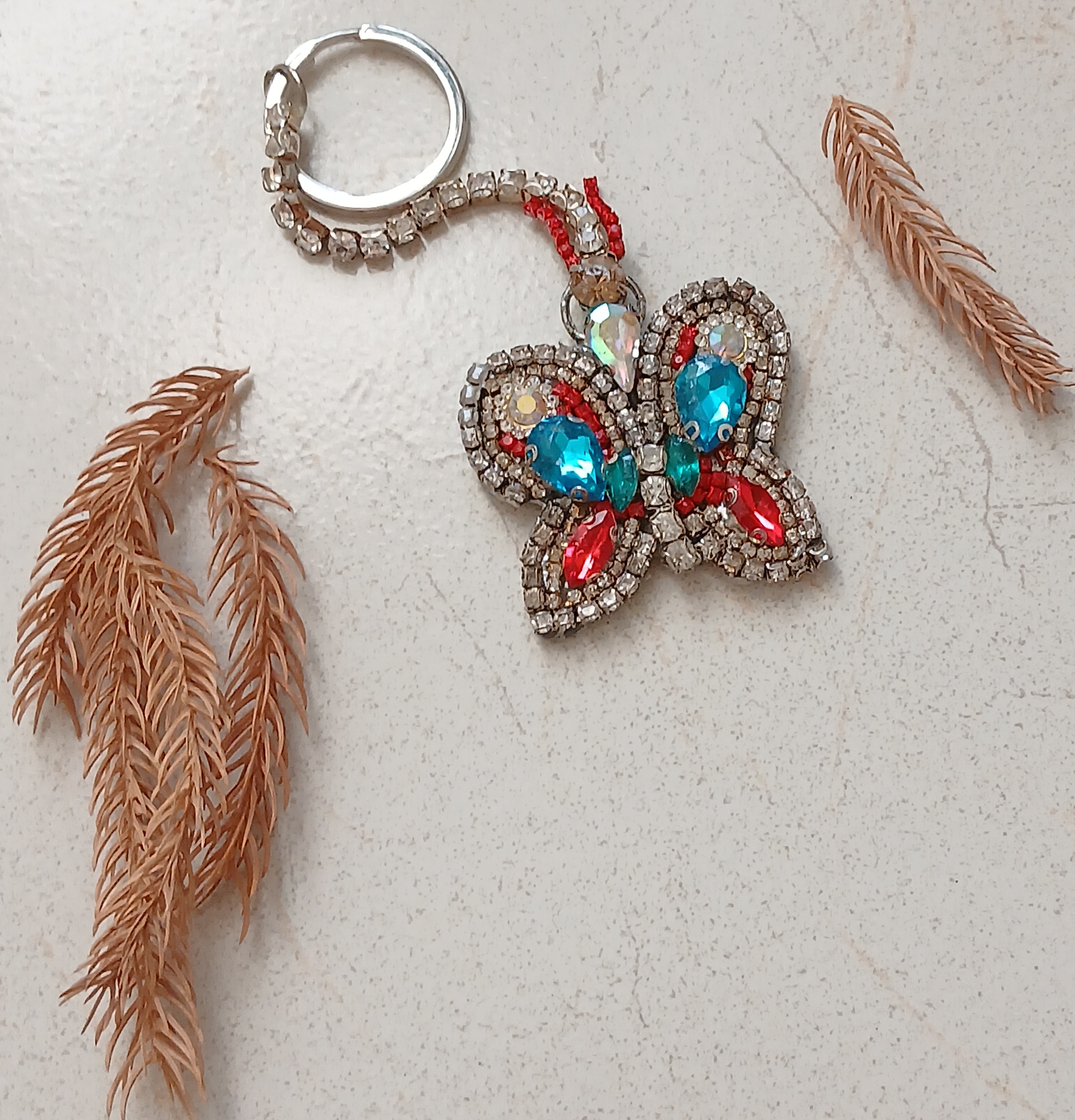 این آویز پرواز با طرح یک پروانه زیبا ساخته شده است. پروانه شامل هشت نگین اتریشی در رنگهای آبی، قرمز و سبز است. دو نگین اشکی آبی و دو نگین قرمز و دو نگین سبز روی بالهای پروانه قرار دارند. همچنین، یک نگین هفترنگ روی سر پروانه و بقیه بدنه پروانه نیز با نگینهای اتریشی تزئین شده است. این طراحی خاص، زیبایی و شکوه ویژهای به این آویز میبخشد."